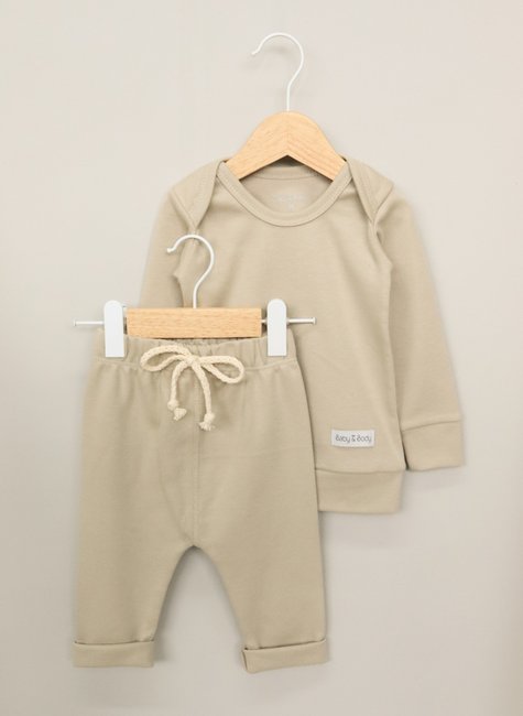 Confeccionado em suedine 100% algodão, o conjunto oferece um toque macio e respirável, ideal para a pele sensível do bebê. A malha leve aquece na medida certa sem causar excesso de calor, tornando-se a escolha perfeita para temperaturas instáveis. A blusa possui gola com entrepasse nos ombros, inspirada na funcionalidade dos bodies, facilitando o vestir e garantindo praticidade nos momentos de troca especialmente importantes na rotina dinâmica com o bebê. A calça complementa o conjunto com modelagem confortável e cós macio, acompanhando cada movimento com liberdade. O cordão decorativo adiciona um detalhe estético moderno.