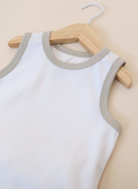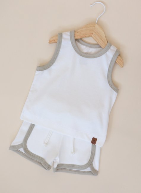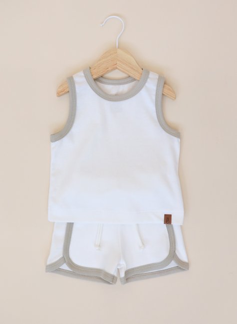 Inspirado no charme das peças antigas, mas com o conforto que o bebê merece, este conjunto combina a leveza do verão com um estilo retrô irresistível. A regata off white com viés caqui cria um visual suave, elegante e cheio de personalidade exatamente o tipo de look que ilumina as celebrações de Ano Novo e acompanha o bebê nas viagens de férias com praticidade e muito conforto.