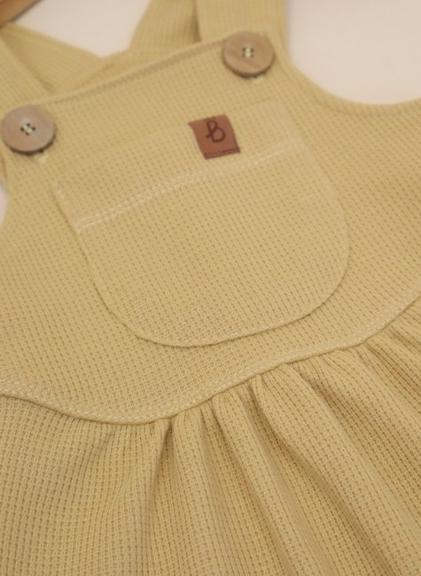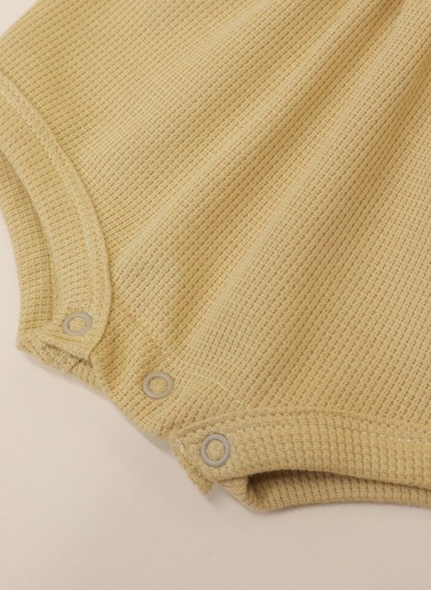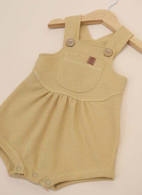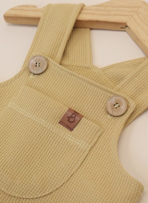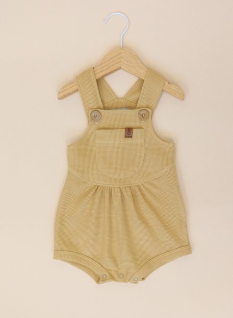 A textura em waffle é o grande diferencial dessa jardineira: ela forma pequenos relevos quadradinhos que lembram a maciez de uma colmeia, proporcionando um toque aconchegante e delicado. Além de ser extremamente agradável, essa textura confere um ar sofisticado e moderno à peça, reforçando o estilo minimalista e atemporal da Baby&Body.