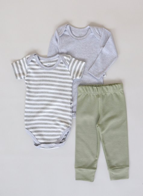 O kit é composto por calça básica, body manga curta e body manga longa, permitindo combinações que se adaptam facilmente às variações de temperatura e às necessidades do dia a dia do bebê.