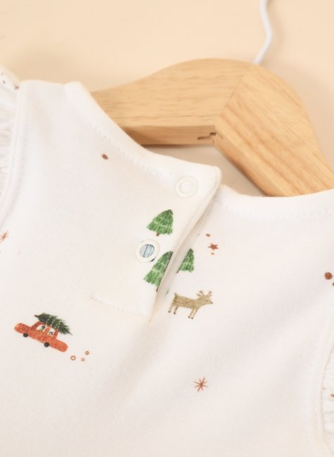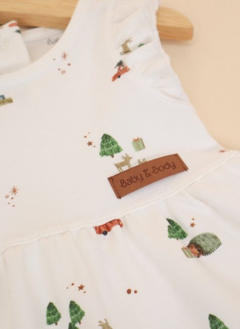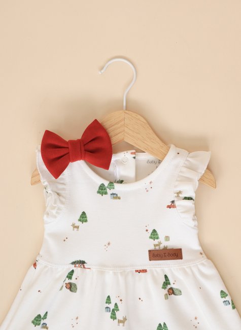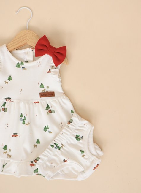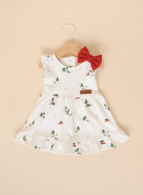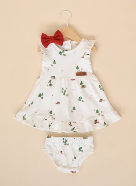 A estampa digital autoral combina delicadeza e charme, misturando símbolos natalinos a um toque lúdico e minimalista, ideal para quem busca um visual encantador sem abrir mão da identidade leve e sofisticada da nossa marca.